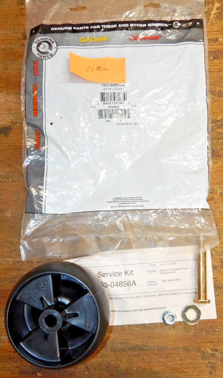 OEM MTD Deck Wheel Kit 753-04856A is a MTD deck wheels / rollers replacement part intended to help restore reliable operation on compatible lawn & garden equipment. Please verify part numbers and fitment details before ordering.