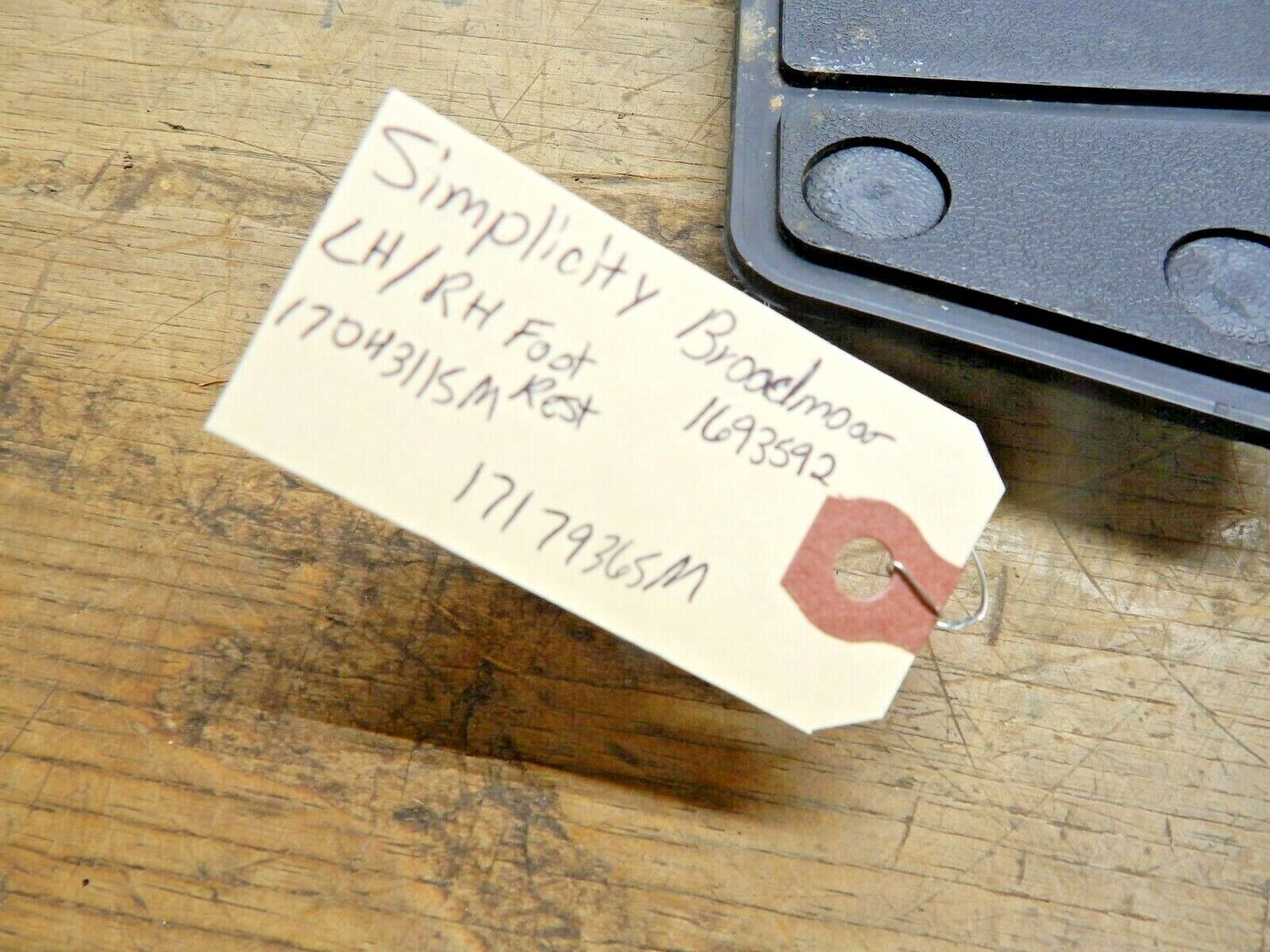 Simplicity #1693592 Broadmoor Riding Mower- Foot Rest LH/RH 1704311SM,1717936SM is a Simplicity batteries replacement part intended to help restore reliable operation on compatible lawn & garden equipment. Please verify part numbers and fitment details before ordering.
